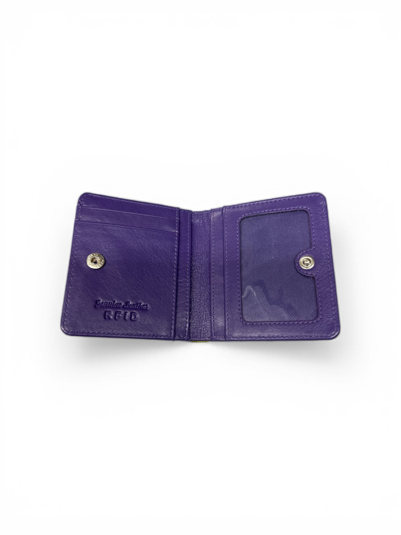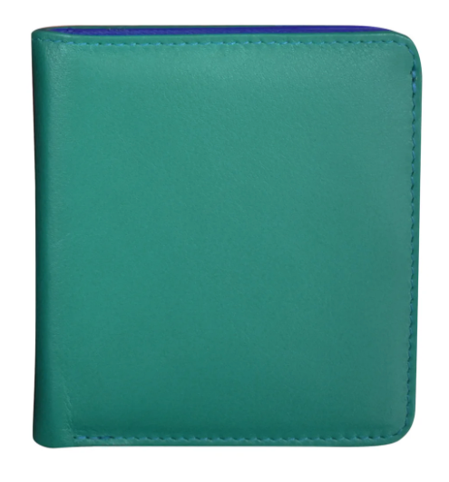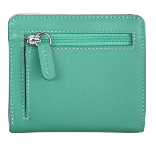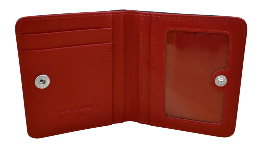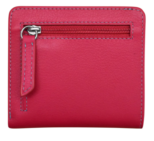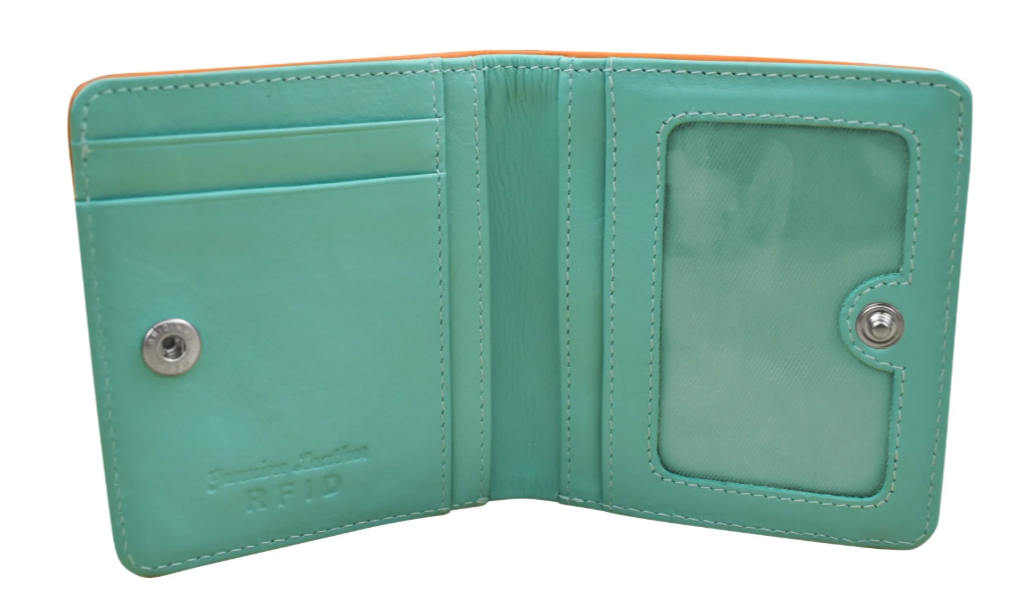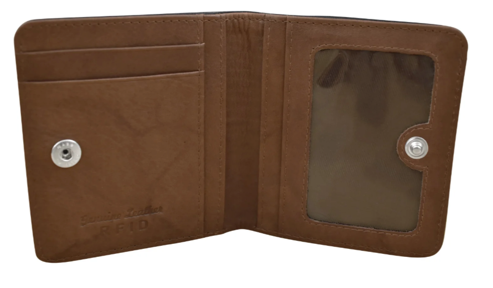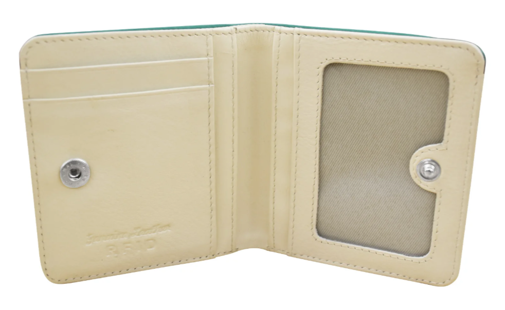 This ILI mini bi-fold wallet is made with the finest quality genuine leather and comes with RFID protection. It has snap button closure and back zippered pocket. The interior has an I.D. window, bill pocket and credit card slots.