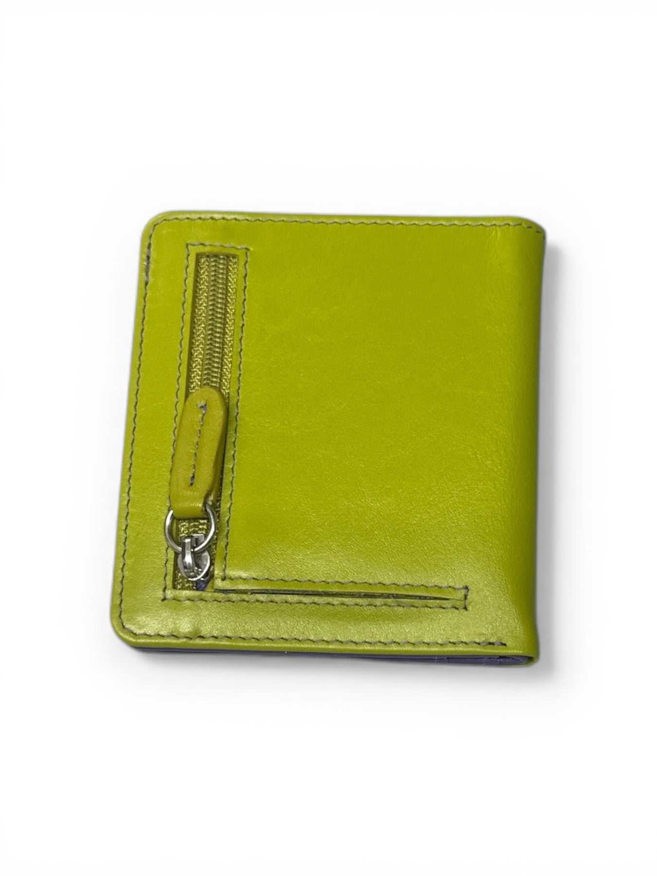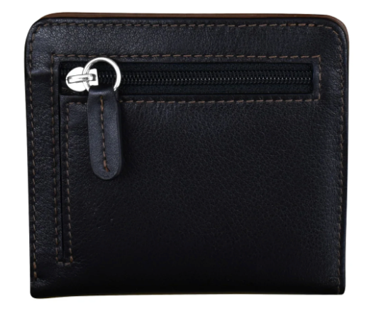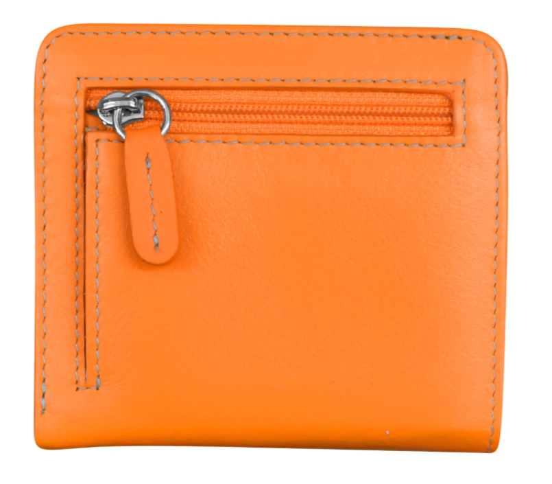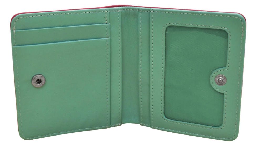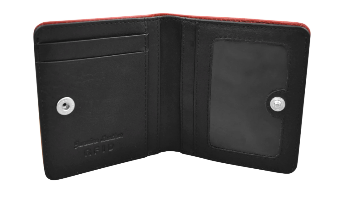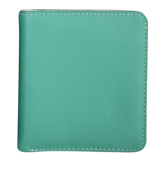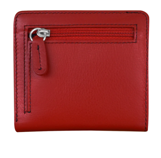 This ILI mini bi-fold wallet is made with the finest quality genuine leather and comes with RFID protection. It has snap button closure and back zippered pocket. The interior has an I.D. window, bill pocket and credit card slots.